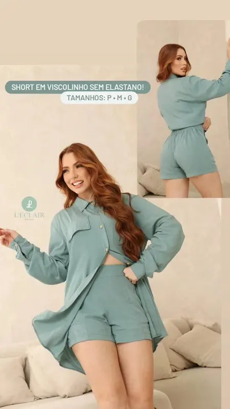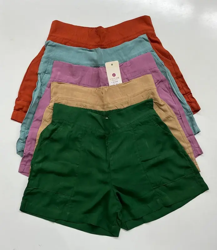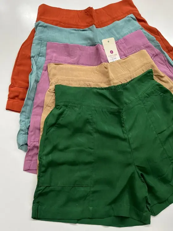 Modelo short em viscolinho com bolso nas laterais, elástico nas costas. Tamanhos: P M e G Cores: terra cota, verde folha, bege, azul celeste, lilas.