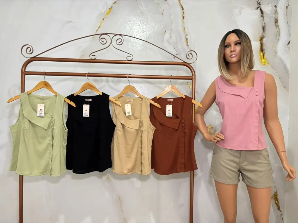 Modelo regata no viscolinho com elastano, detalhe de gola e botões fake na lateral. Tam: m, g e gg Cores: chocolate, areia, pistache, rose e preto.
